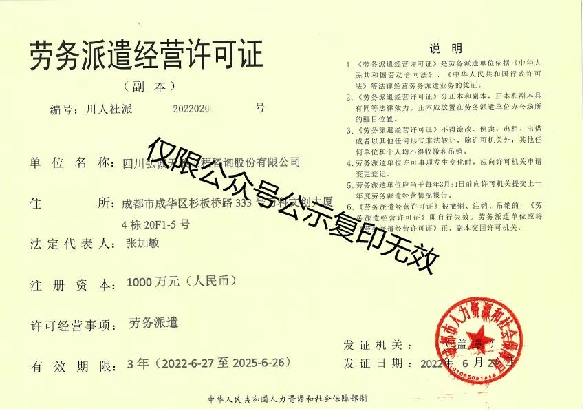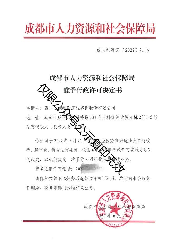 6月27日,四川弘誠天毅工程咨詢股份有限公司正式獲得成都市人社局的批復(fù),拿到勞務(wù)派遣經(jīng)營許可證。