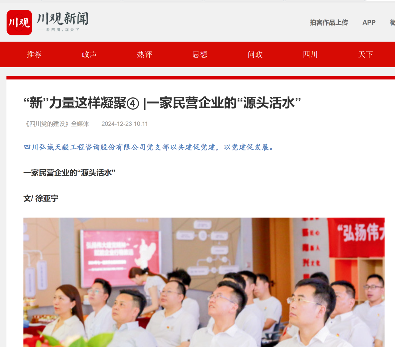 近日,由中共四川省委主管主辦的《四川黨的建設》雜志發表了一篇題為《一家民營企業的“源頭活水”》的深度報道,聚焦四川弘誠天毅工程咨詢股份有限公司(以下簡稱“弘誠天毅”)在黨建工作上的創新實踐與顯著成效,生動詮釋了“以共建促黨建,以黨建促發展”的核心理念。